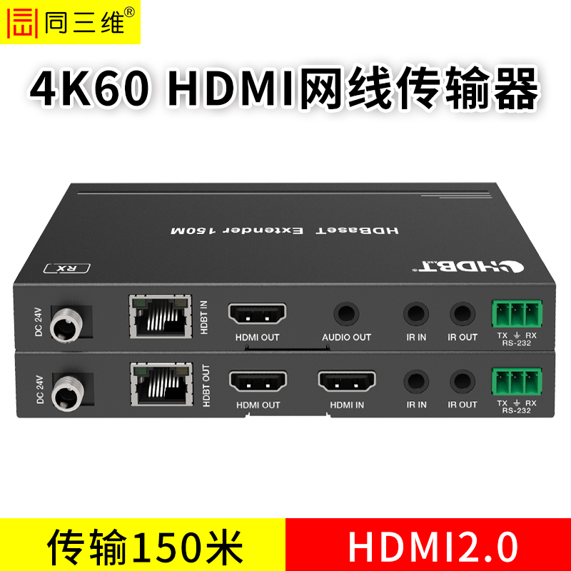 同三维T802-4K超高清HDMI2.0网线4K60P传输器150米带HDMI环出和IR控制,接收端带独立音频解嵌 这款HDMI 150米延长器(HDBaseT)可以通过单根CAT网线,在发射器和接收器之间,将高清音视频信号、RS-232信号和双向IR信号延长至150米。视频分辨率最高支持4K2K@